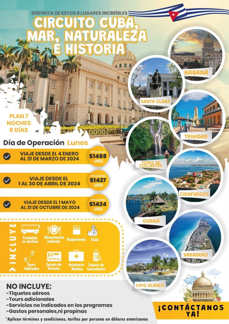 ¡Descubre la vibrante isla de Cuba con nosotros! Sumérgete en la rica cultura, la música contagiosa y la calidez de su gente. Ciudad sin precedentes, La Habana conserva ese atractivo mítico e imperecedero que la convirtió en la más importante del reino de España en esta parte del orbe. Su histórica zona, declarada Patrimonio Cultural de la Humanidad, es tiempo pasado envuelto en el halo mágico del encanto. Edificaciones militares y residenciales que marcaron hitos en los ya lejanos siglos XVI, XVII y XVIII, siguen mostrando la impronta de entonces: sus calles adoquinadas, sus musgos ancestrales, sus balaustradas y los arcos de medio punto que acrisolan los interiores coloniales descomponiendo los colores cálidos del Trópico. A ello se imbrica, armónicamente, una Habana privilegiada por excelentes playas ubicadas al este de la ciudad, notables centros comerciales, amplias avenidas y una infraestructura turística en constante crecimiento. ¡Ven y descubre la magia de Cuba con nuestra agencia de viajes!